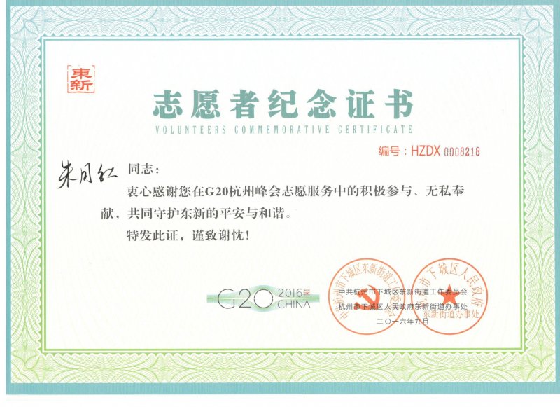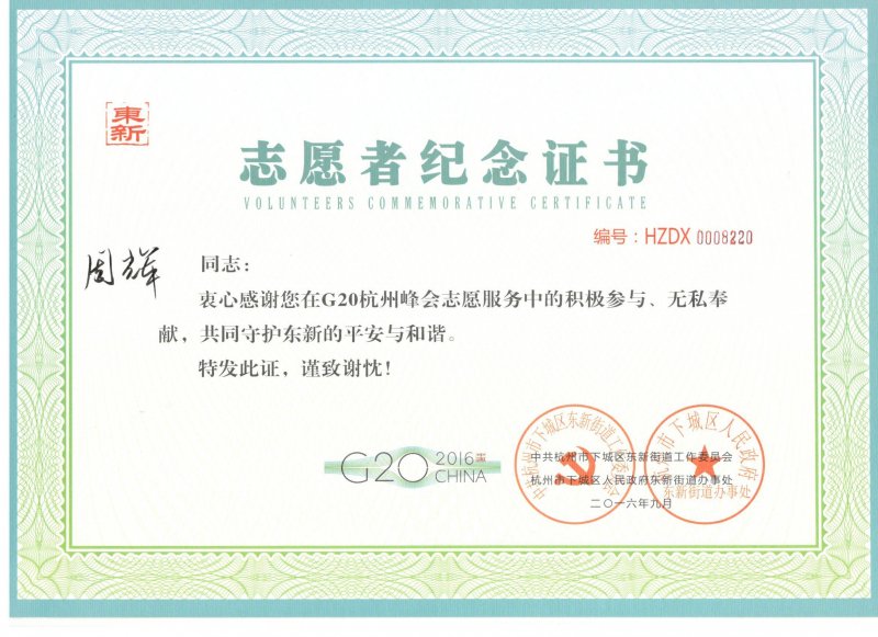 舉世矚目的G20峰會(huì )已順利落下帷幕,公司在峰會(huì )期間全力保障杭州東新安保工作,杭州市下城區東新街道工作委員會(huì )及下城區人民政府東新街道辦事處予以高度肯定和感謝,同時(shí)頒發(fā)了志愿者紀念證書(shū)。