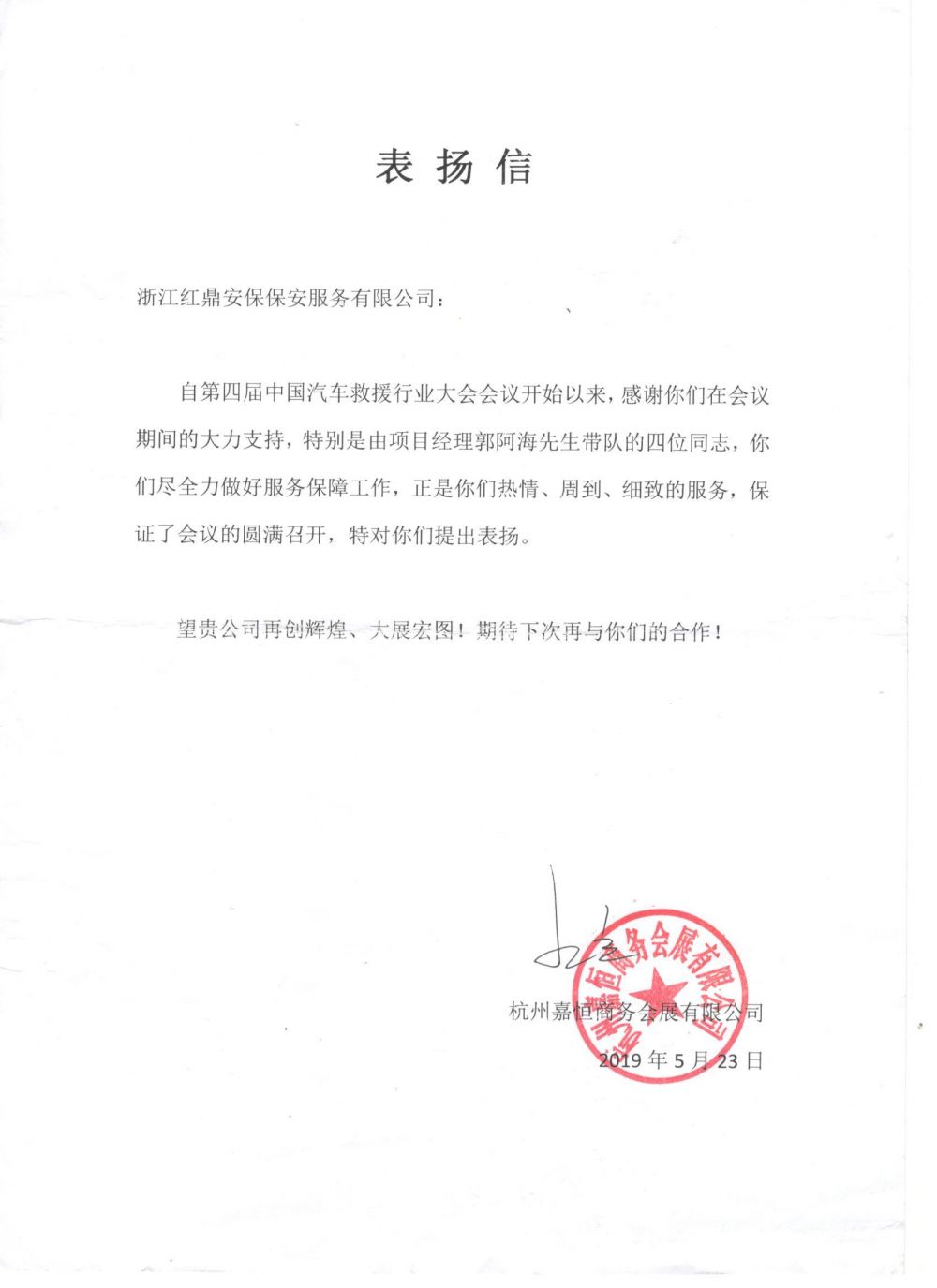 2019年5月22日,第四屆中國汽車(chē)救援行業(yè)大會(huì )在浙商開(kāi)元名酒店召開(kāi),受杭州嘉恒商務(wù)會(huì )展有限公司委托,浙江紅鼎保安服務(wù)有限公司負責此次會(huì )議期間的安保任務(wù),在項目經(jīng)理郭阿海帶領(lǐng)下,所有隊員盡全力做好服務(wù)保障工作,保證了會(huì )議的圓滿(mǎn)召開(kāi),最終獲得客戶(hù)單位的滿(mǎn)意和表?yè)P。