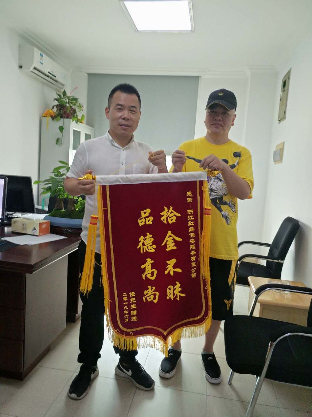 失主看到自己錢(qián)包內物品完好無(wú)損,非常感動(dòng),之后送上“拾金不昧、品德高尚”錦旗表示感謝!