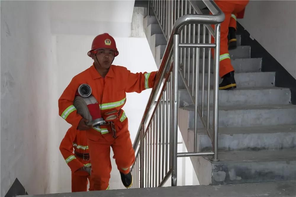 下午比賽場(chǎng)地定在椒江區消防救援大隊,比賽科目為5層負重登樓,且必須由3名隊員團隊協(xié)作才能完成。參賽隊員統一著(zhù)防護服、消防頭盔、消防安全腰帶、防護靴、消防手套等,團隊必須攜帶消防水帶一盤(pán)、滅火器4公斤一具、消防水槍一把。隊員通力合作,合理分工,從一層外3米處為起點(diǎn),5層終點(diǎn)線(xiàn)為止,以?xún)?yōu)異成績(jì)完成比賽。