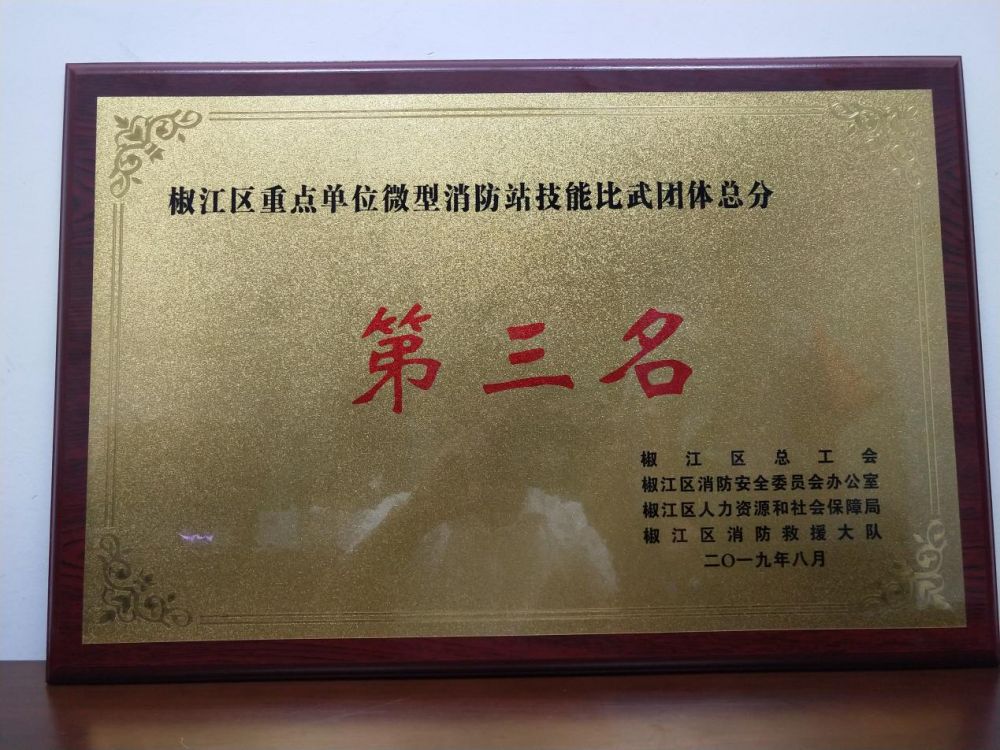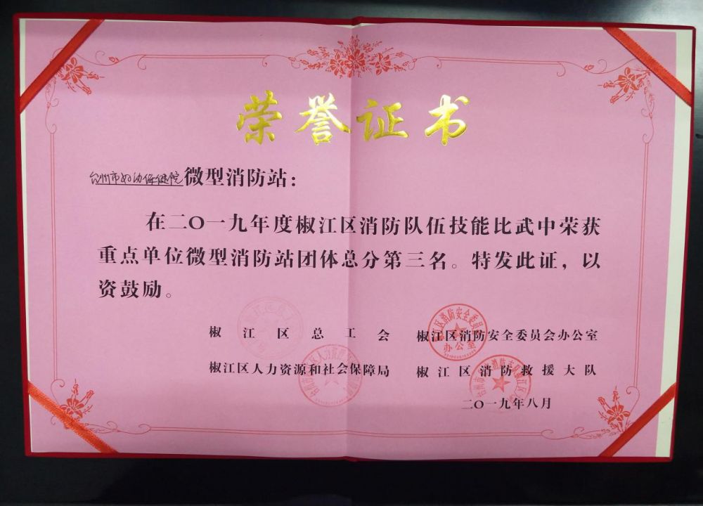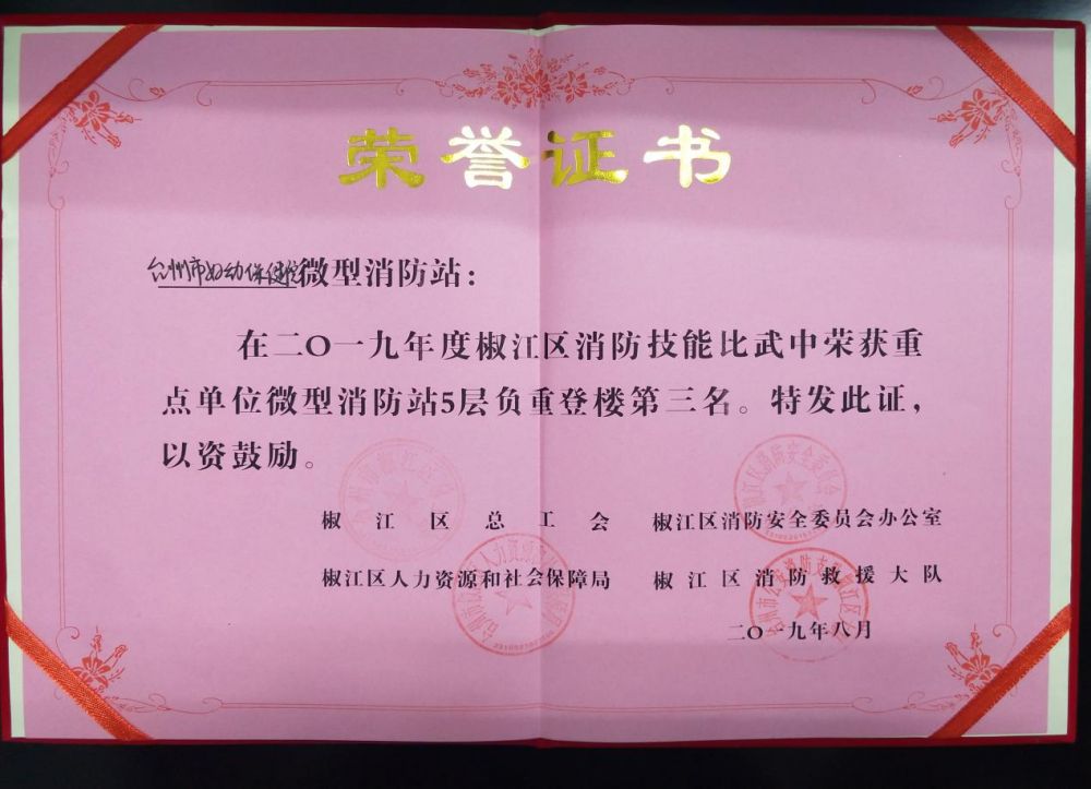 經(jīng)過(guò)一天的奮力拼搏,最終榮獲2019年度椒江區消防技能比武重點(diǎn)單位微型消防站團體總分第三名、5層負重登樓第三名。