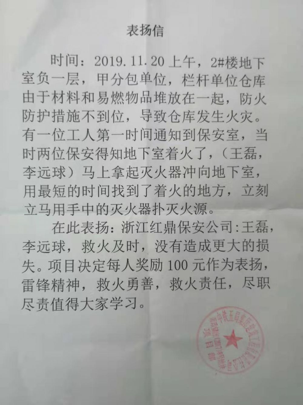 2019年11月20日上午,浙江紅鼎保安服務(wù)有限公司駐點(diǎn)單位中鐵五局集團建筑工程有限責任公司蕭山某地塊項目2#樓底下負一層發(fā)生火宅,有一位工人第一時(shí)間通知保安室。公司派駐保安王磊、李遠球得知情況后,馬上拿起滅火器沖向地下室,用最短的時(shí)間找到了著(zhù)火源,立刻用滅火器撲滅火源,第一時(shí)間避免了更大的損失。