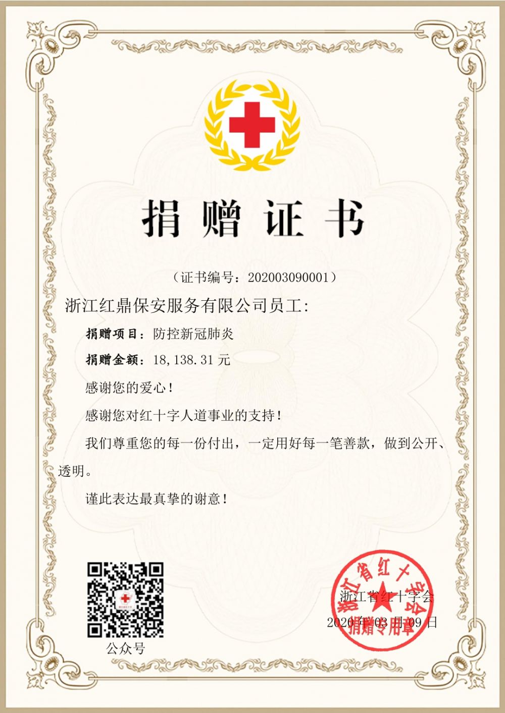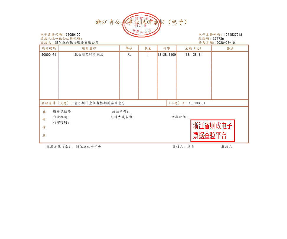 空前嚴峻的疫情面前,堅守崗位是奉獻,自我管理是貢獻。紅鼎保安的團隊,不僅在抗擊疫情的一線(xiàn)全力付出,履行自身的職責。更心系于各地疫情防控,鑒于各地抗疫資金物資的緊張,截止3月9日,全體員工一共為抗疫自發(fā)捐款合計18138.31元。這一串有零有整的數字,代表著(zhù)一個(gè)一個(gè)對社會(huì )和國家的拳拳心意和小小祝福。公司在統一收到款項后,非常感動(dòng),決定好事成雙,按照員工捐款數同等金額亦捐出相應款項,于是共計36276.62元善款,在3月9日下午通過(guò)銀行匯款方式全部捐至浙江省紅十字會(huì ),資金定向用于疫情防控相關(guān)支出事項。