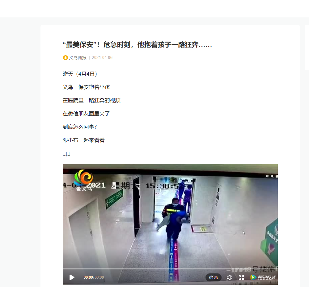 媒體賬號義烏商報在騰訊媒體發(fā)文宣揚了浙江紅鼎保安服務(wù)有限公司執勤保安王洪銘同志的英勇事跡