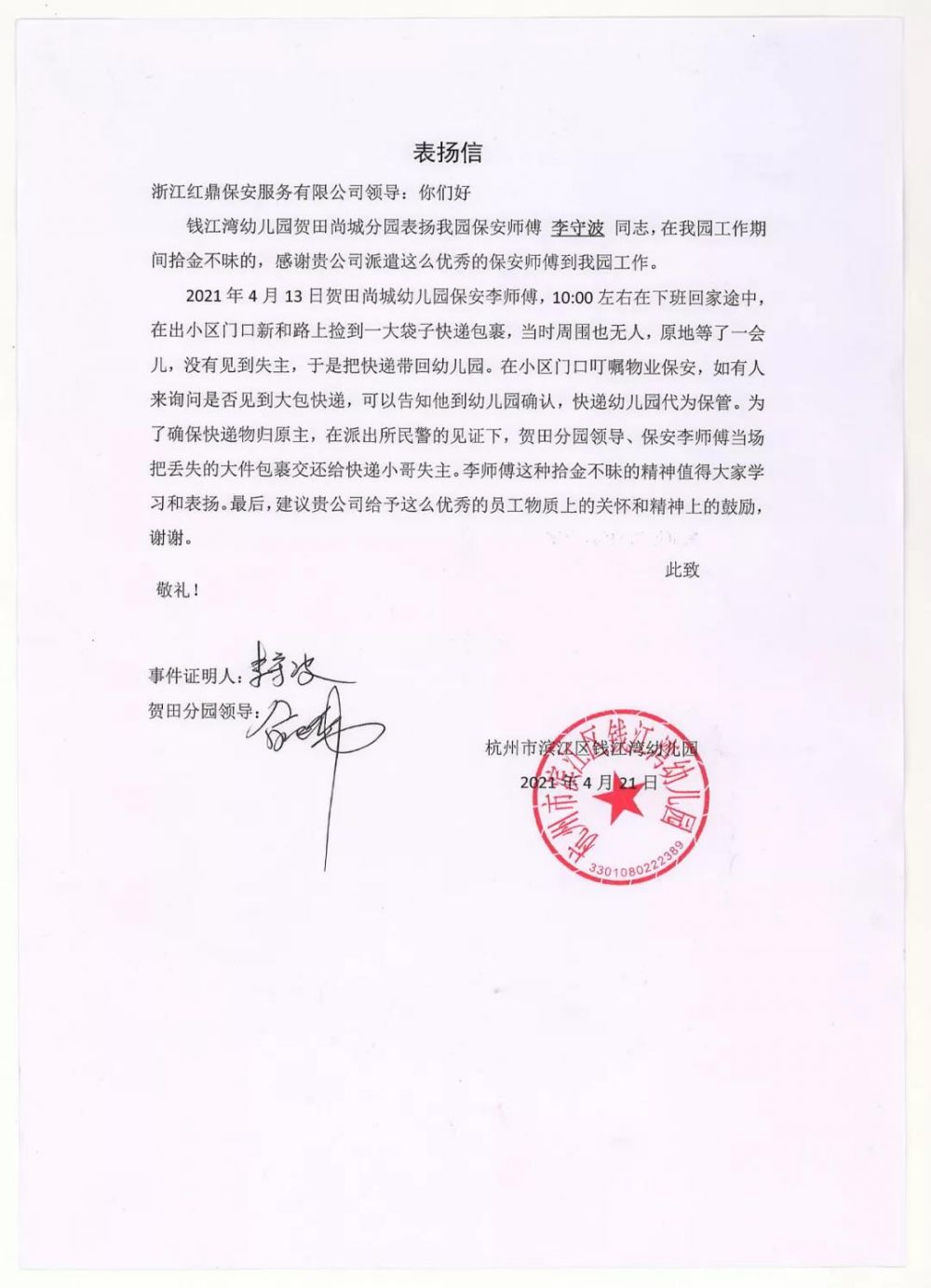 2021年4月13日賀田尚城幼兒園,我公司駐崗保安李守波同志10:00左右下班回家時(shí),在小區門(mén)口新和路上撿到一大袋快遞包裹,見(jiàn)周?chē)鸁o(wú)人,便原地等了一會(huì )兒,沒(méi)有等到失主,于是便把快遞帶回了幼兒園。在小區門(mén)口叮囑物業(yè)保安,如有人來(lái)詢(xún)問(wèn)是否見(jiàn)到大包快遞,可以告知他到幼兒園認領(lǐng),快遞由幼兒園代為保管。
