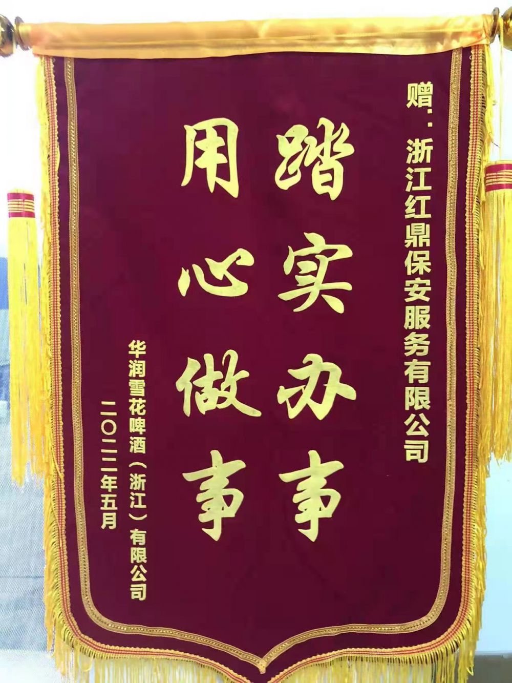 近日,浙江紅鼎保安服務(wù)有限公司收到華潤雪花啤酒(浙江)有限公司送來(lái)的一面印有“踏實(shí)辦事,用心做事”字樣的錦旗。