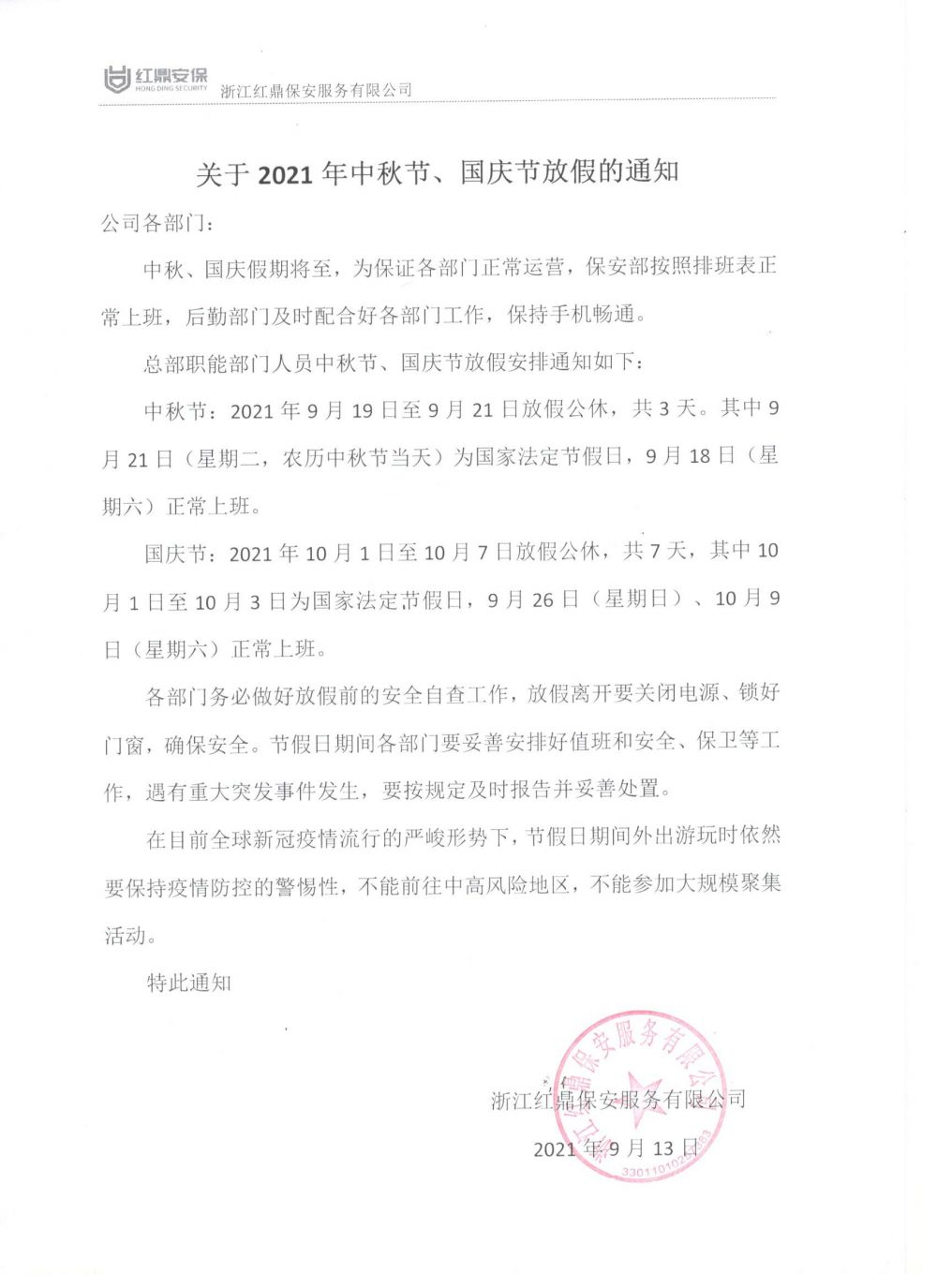 關(guān)于2021年中秋節、國慶節放假的通知