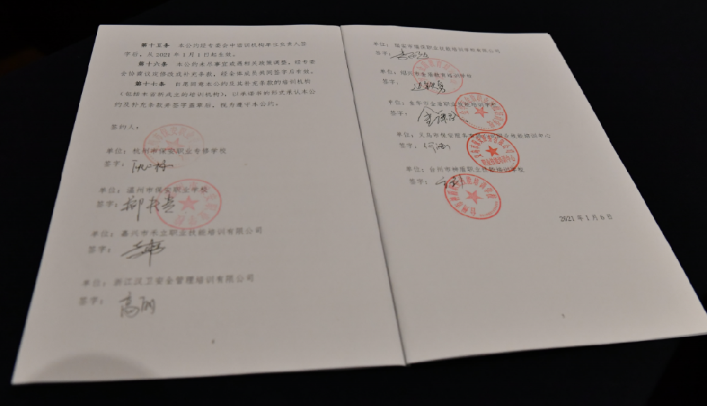 ▲9家培訓機構共同簽署的《浙江省保安培訓機構自律公約》省保安協(xié)會(huì )會(huì )長(cháng)何建軍做重要講話(huà),他對專(zhuān)委會(huì )的成立表示熱烈的祝賀,對專(zhuān)委會(huì )的工作方法和工作方向提出了指導性意見(jiàn)。何會(huì )長(cháng)強調,保安行業(yè)要更加重視教育培訓工作,將此項工作作為戰略性工作來(lái)抓;要更加重視培訓骨干的隊伍建設,聚焦骨干培訓人才的培養;要更加發(fā)揮好《自律公約》的作用,促進(jìn)教育培訓機構的健康發(fā)展;要更加注重發(fā)揮保安人才教育培訓交流平臺的作用,打造一流的人才交流平臺。